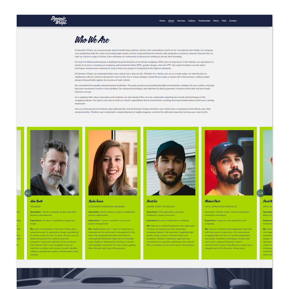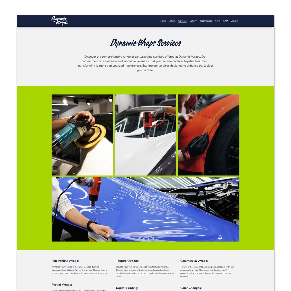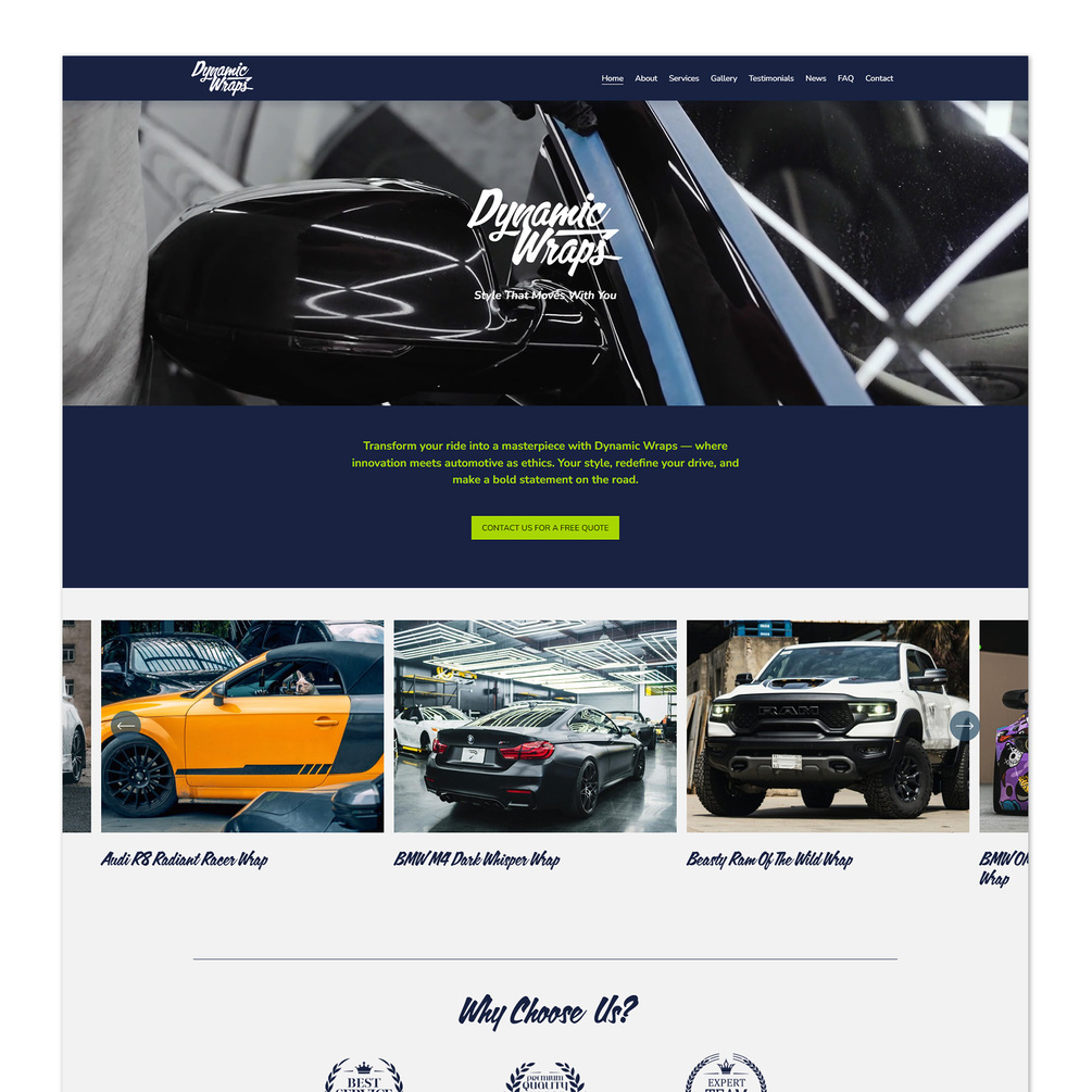 Modern premium design of Dynamic Wraps website template design. Pre-built with actual text and images to mimic auto mechanic repair service business. Built on Squarespace, easy use and update with your business branding.