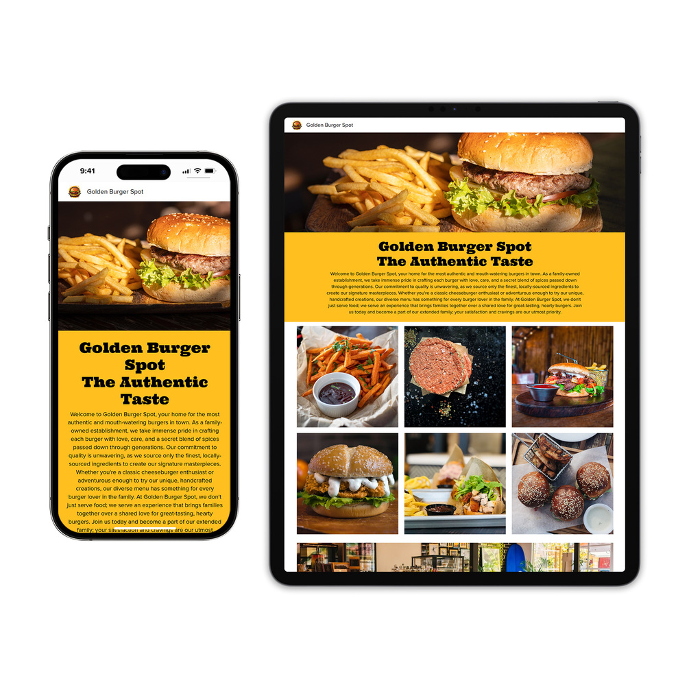 Google Site Golden Burger Spot website template, professionally designed with a modern, user-friendly layout. Fully customizable to reflect your brand, the theme features clean visuals and organized sections to showcase your business and deliver clear, informative content to your customers.