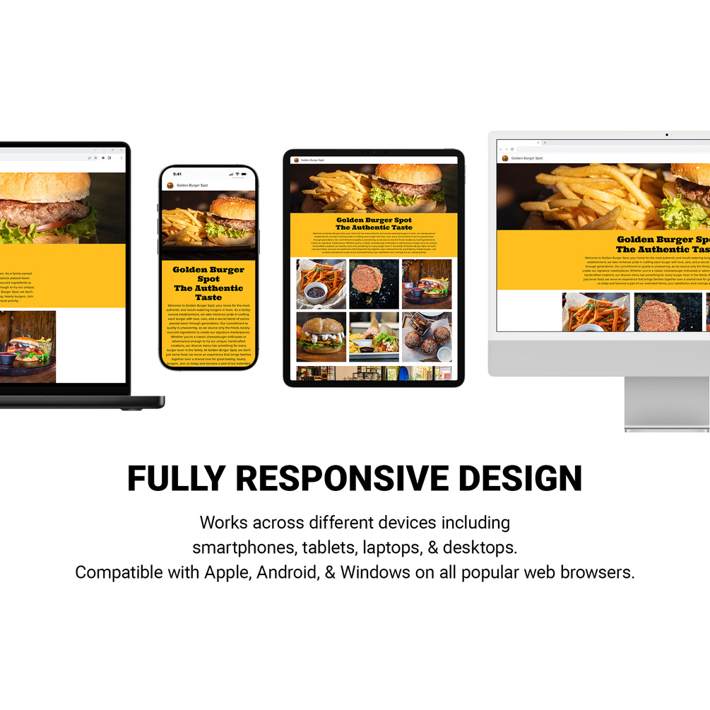 Golden Burger Spot Google Sites template is a ready-to-use website. Each purchase comes with one license, and volume discounts are offered for professionals creative agency or freelancers.